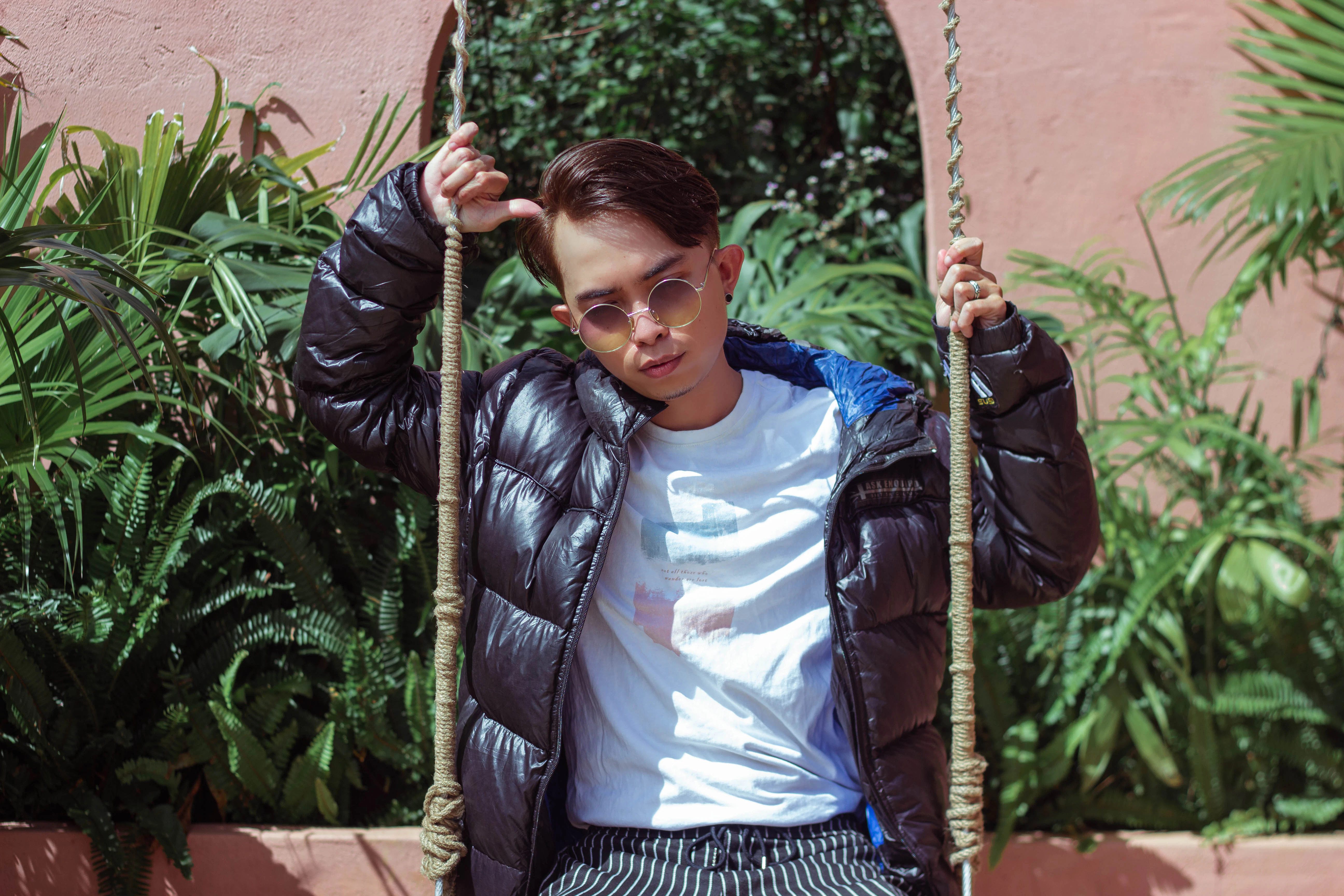 girl in blue and white striped shirt and black and white striped pants sitting on swing