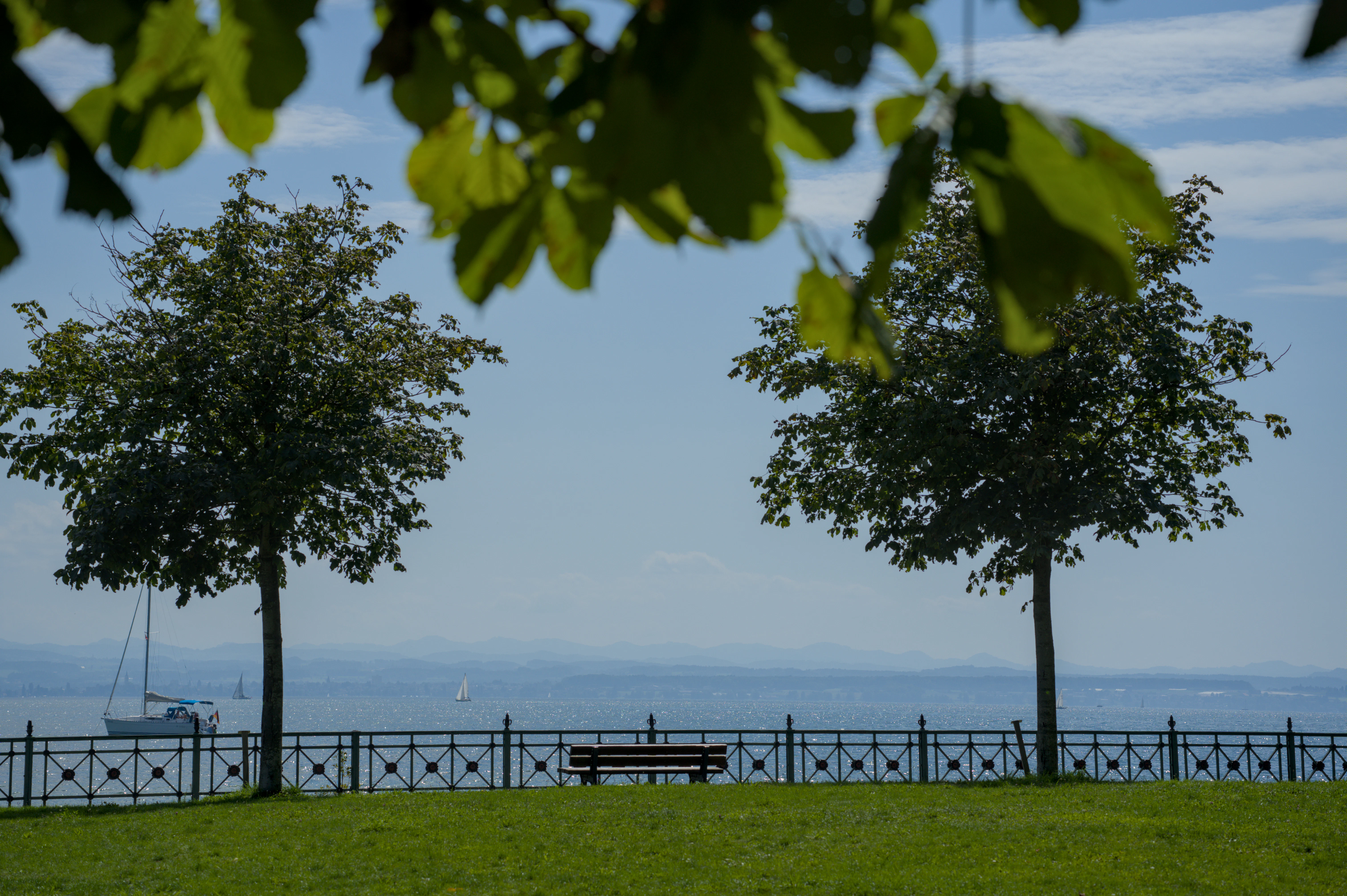 Palmengesäumte Seepromenade vom Hafen bis zum Schloss mit Alpenpanorama und Schiffsanlegern