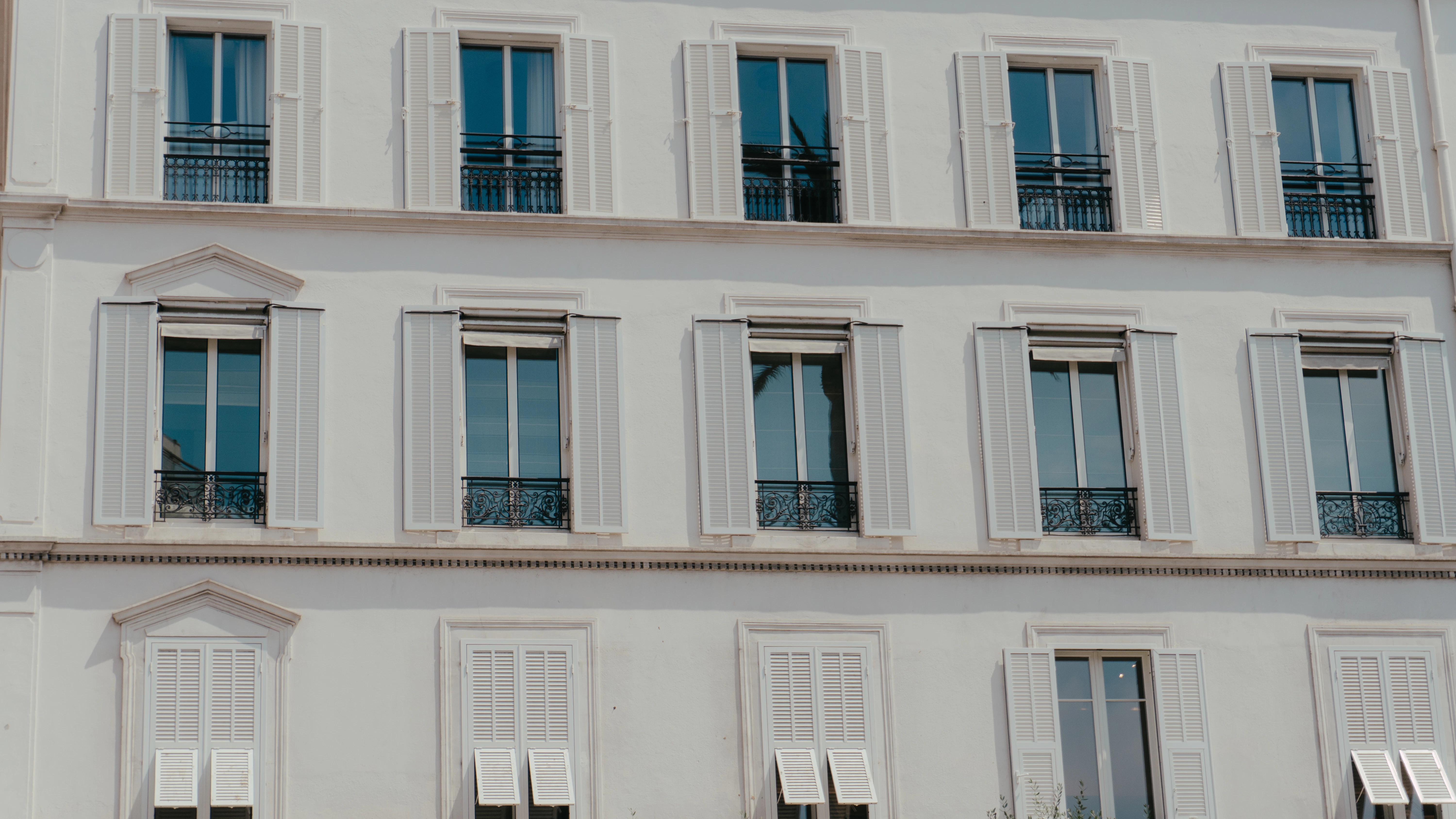 A white building facade with multiple windows.