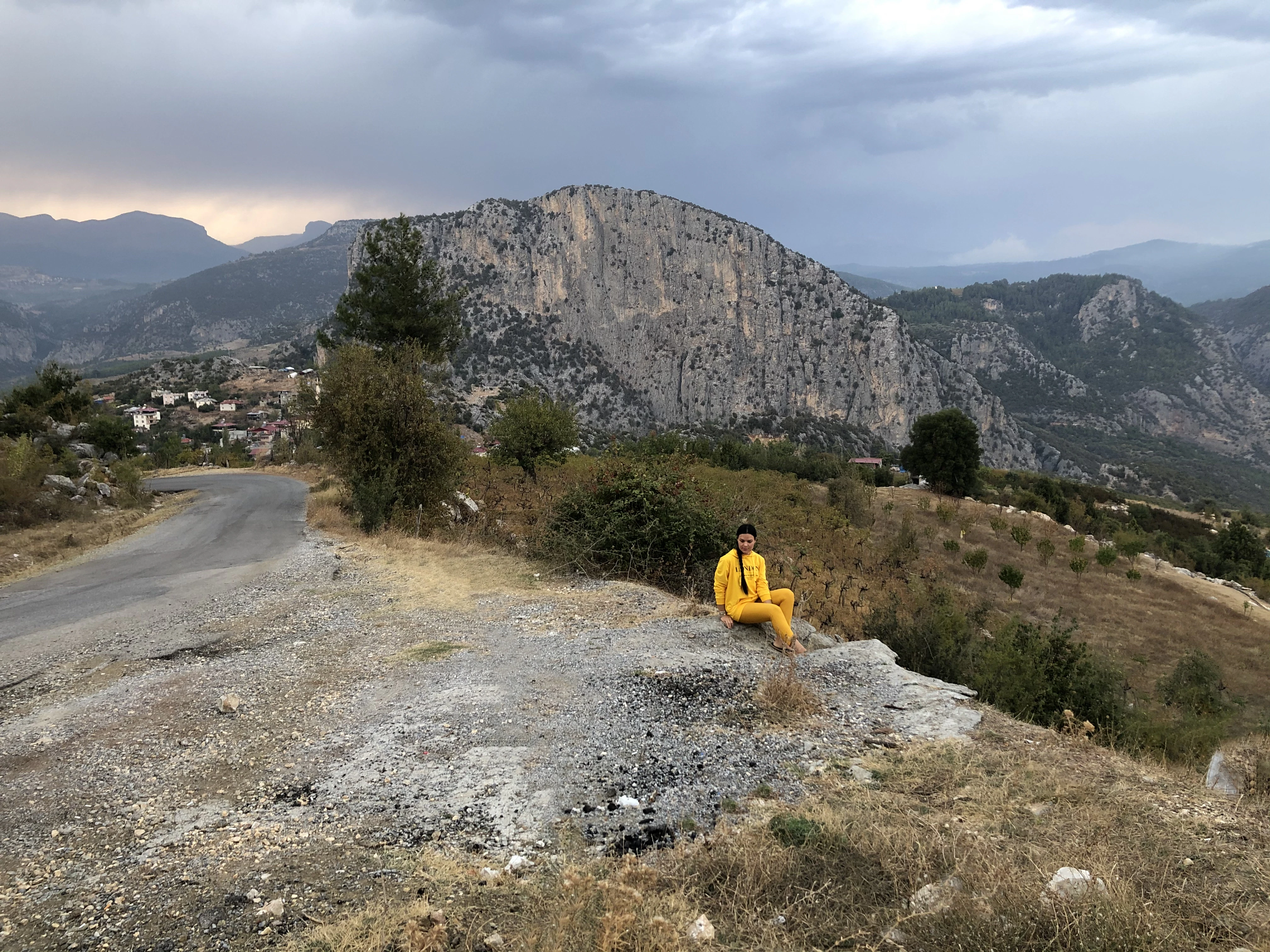 person in yellow jacket sitting on brown rock formation during daytime