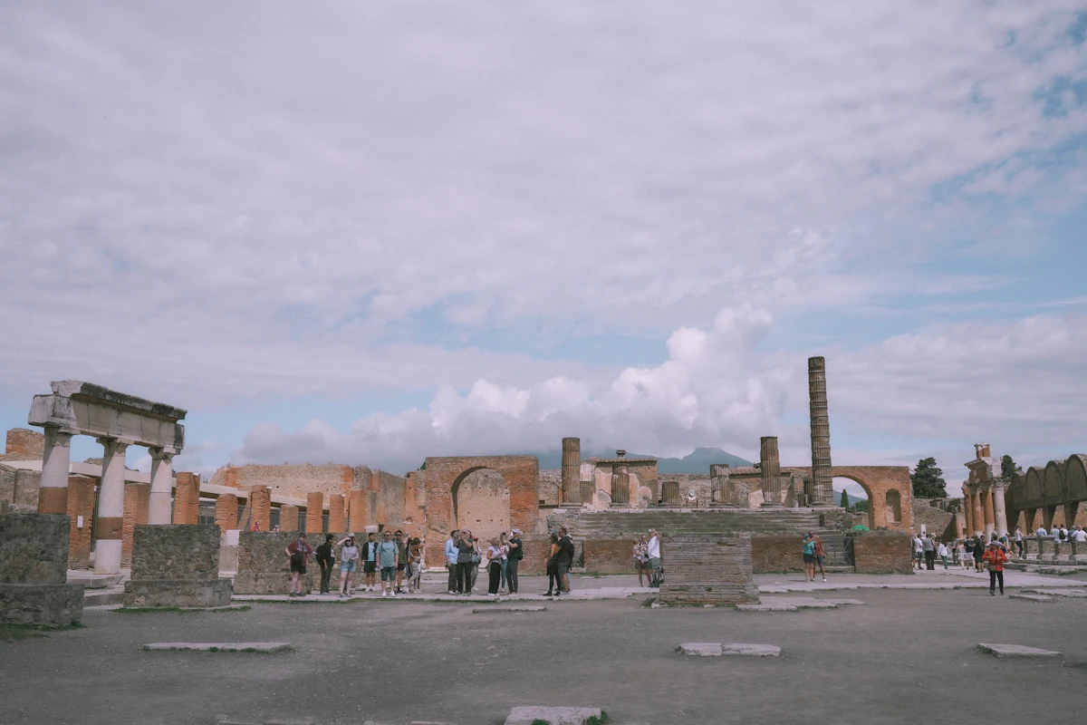 Ancient roman ruins with scattered tourists under cloudy sky