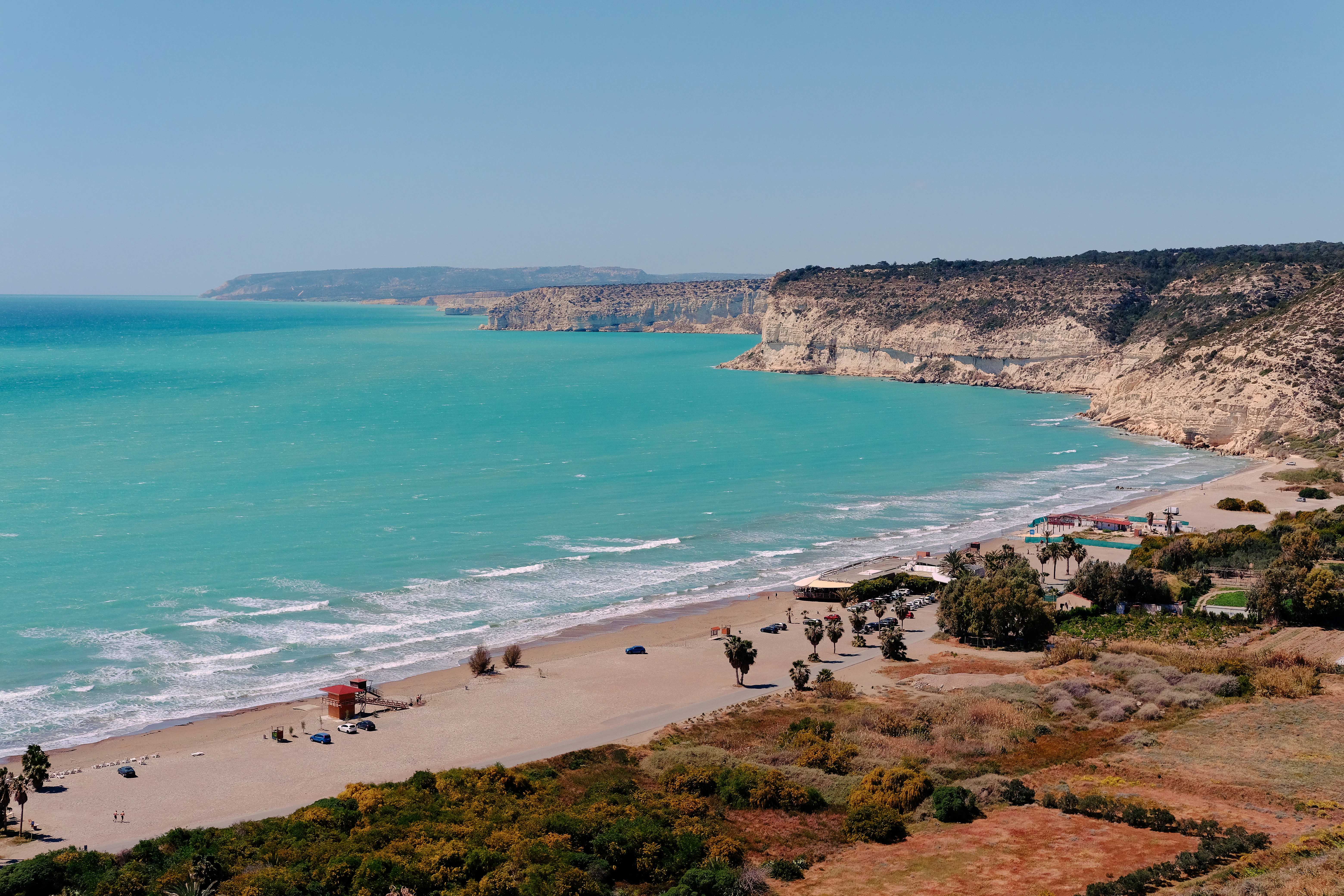 Turquoise ocean meets sandy beach with cliffs.