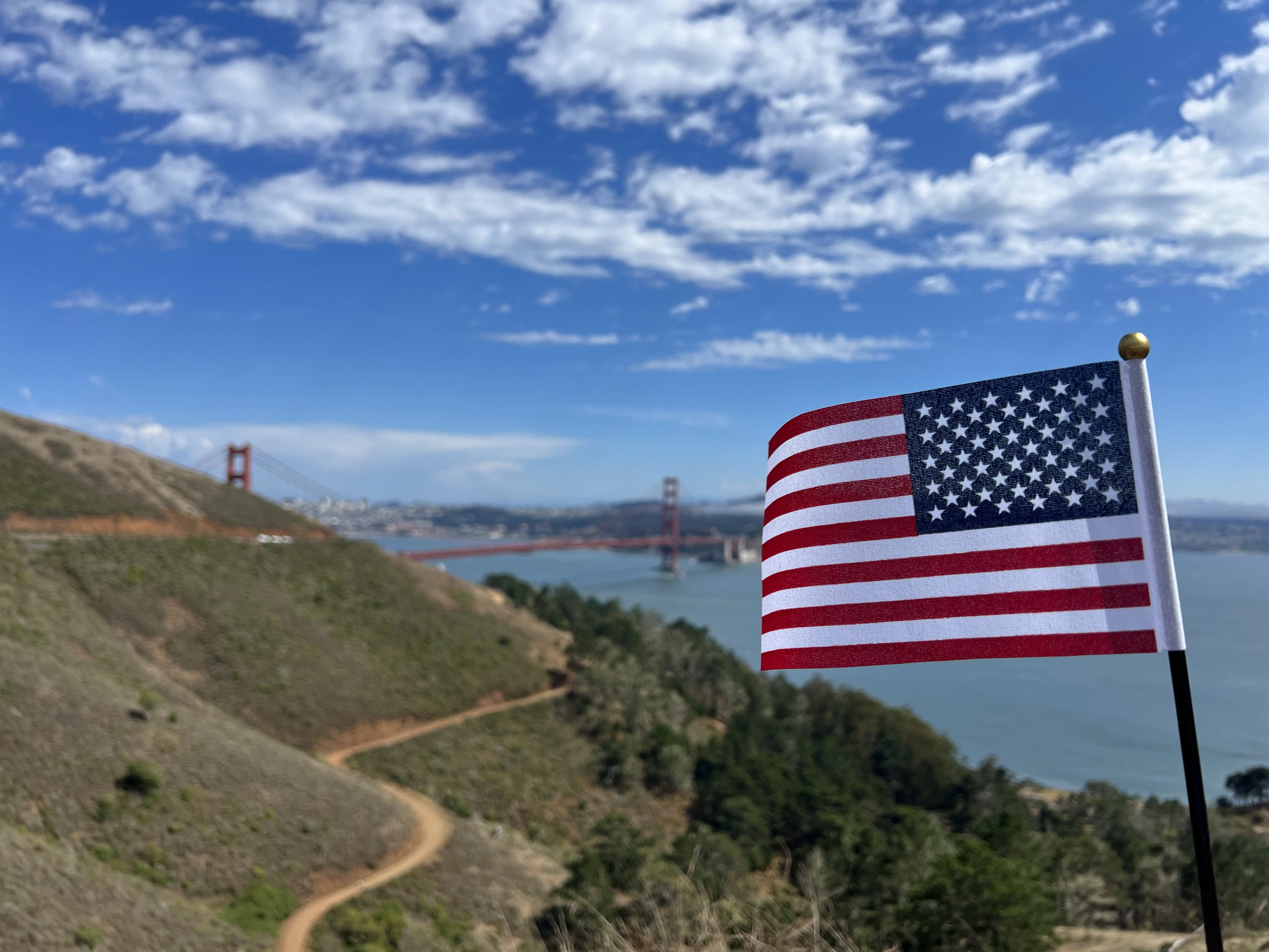 an american flag on top of a hill with a view of the golden gate bridge