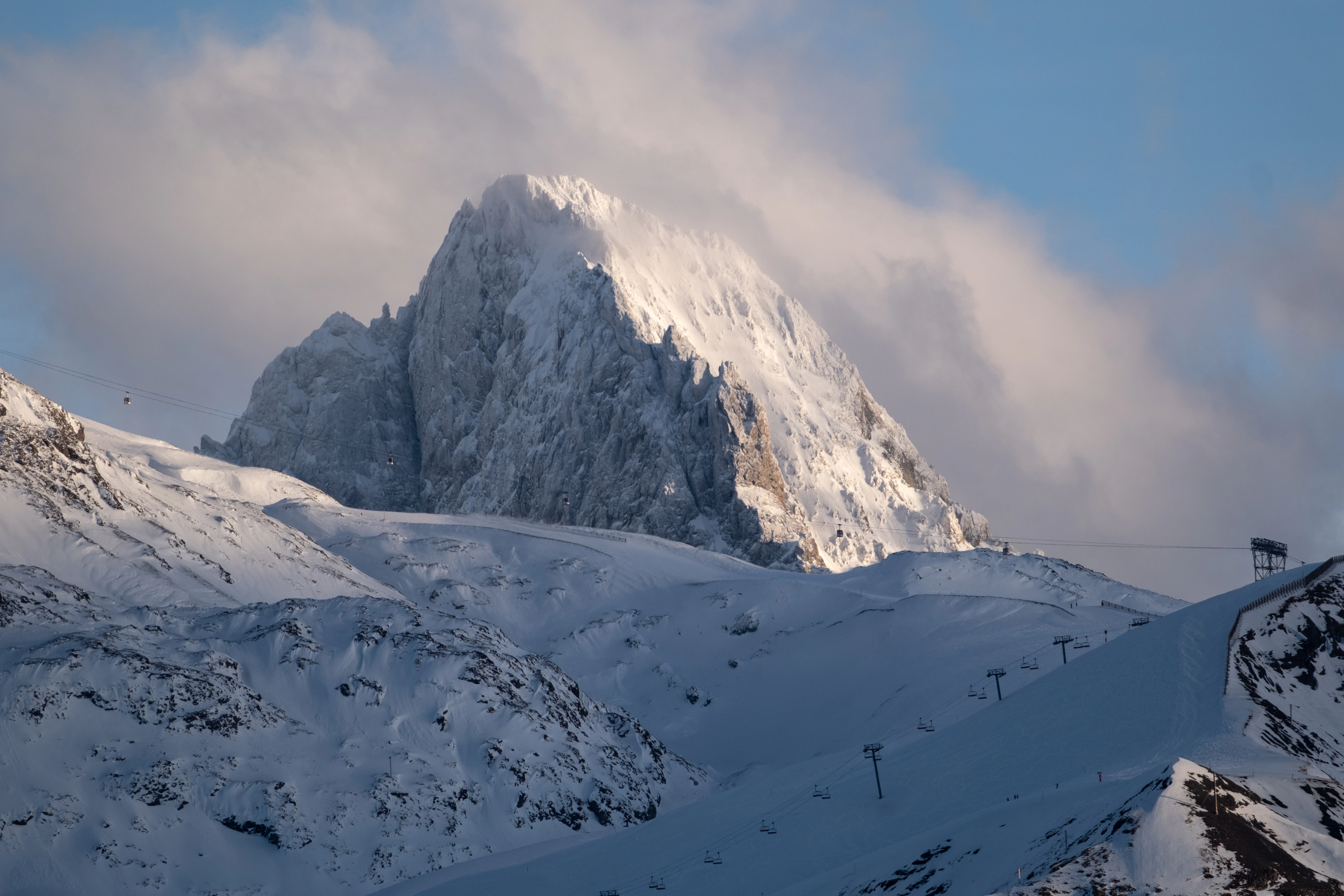a mountain covered in snow under a cloudy sky